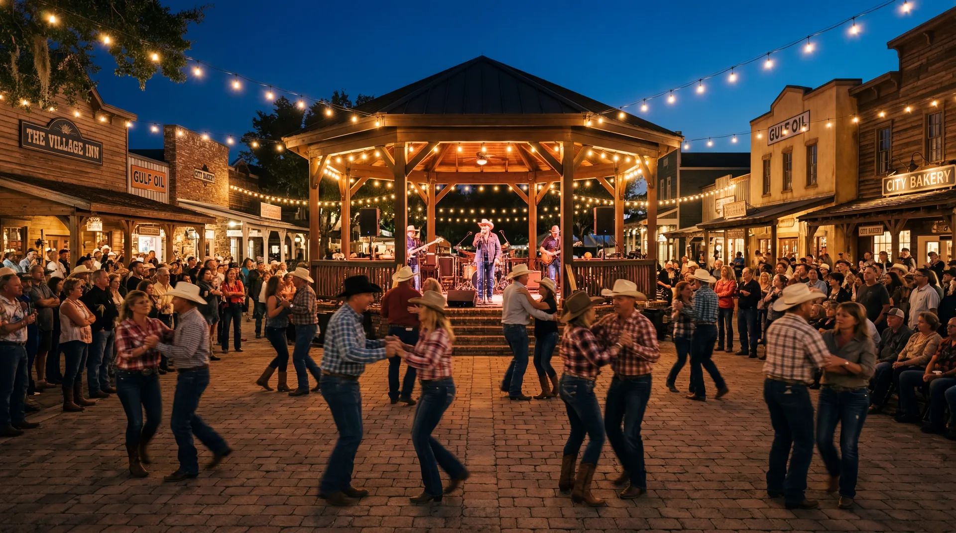 The town squares feature live entertainment almost every night of the week. Music typically starts around 5:00 PM and runs until 9:00 PM. The lineup rotates nightly with different bands and genres — country, rock, jazz, oldies, and more.