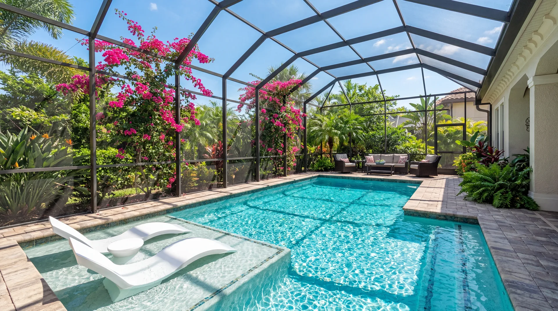 Most pools in The Villages have screened-in lanais (enclosed patios) that keep out bugs and debris. This is standard for Florida construction and makes outdoor living comfortable year-round.